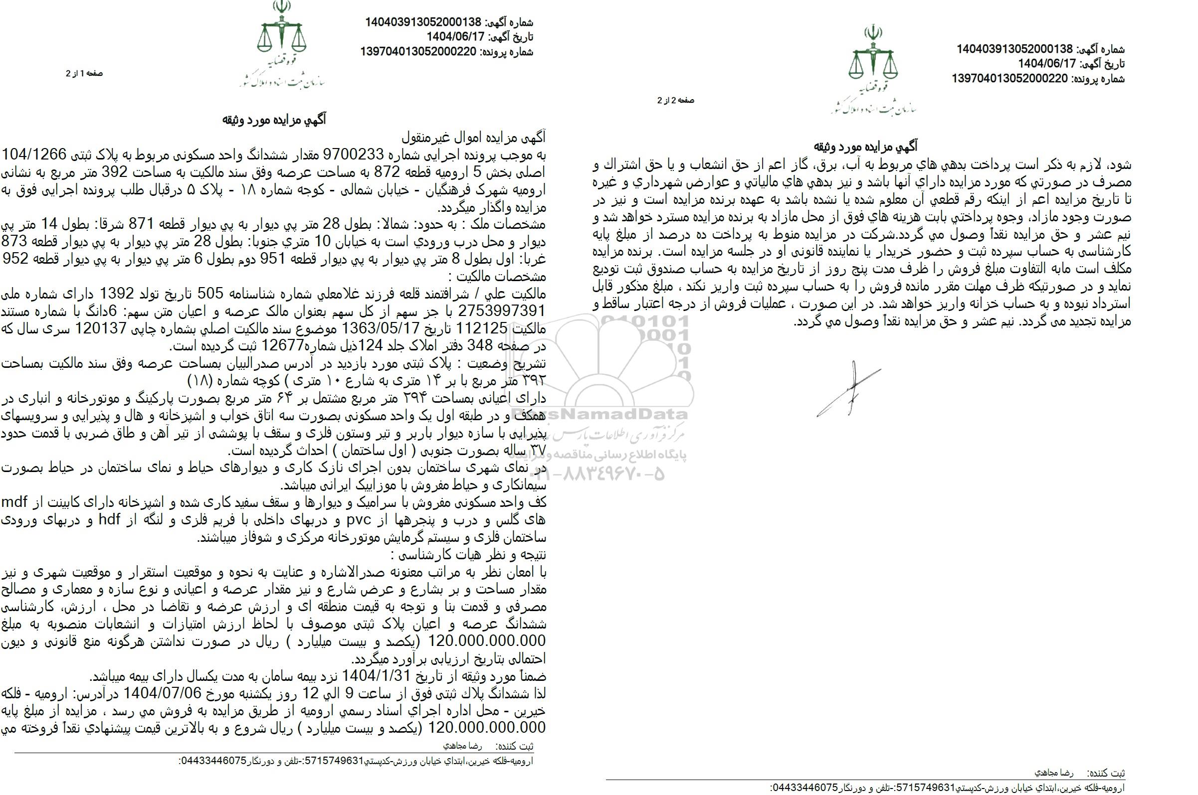 مزایده ششدانگ واحد مسکونی به پلاک ثبتی 104.1266 اصلی بخش 5