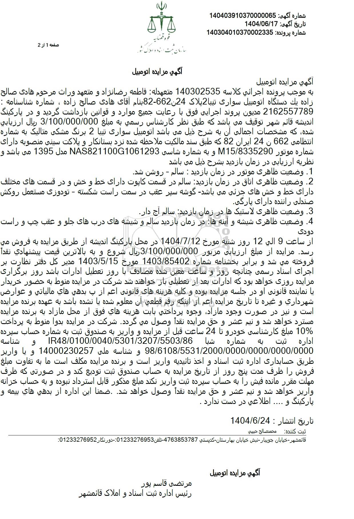 مزایده از ساعت 9 الی 12 ظهر روز شنبه تاریخ 1404.7.12