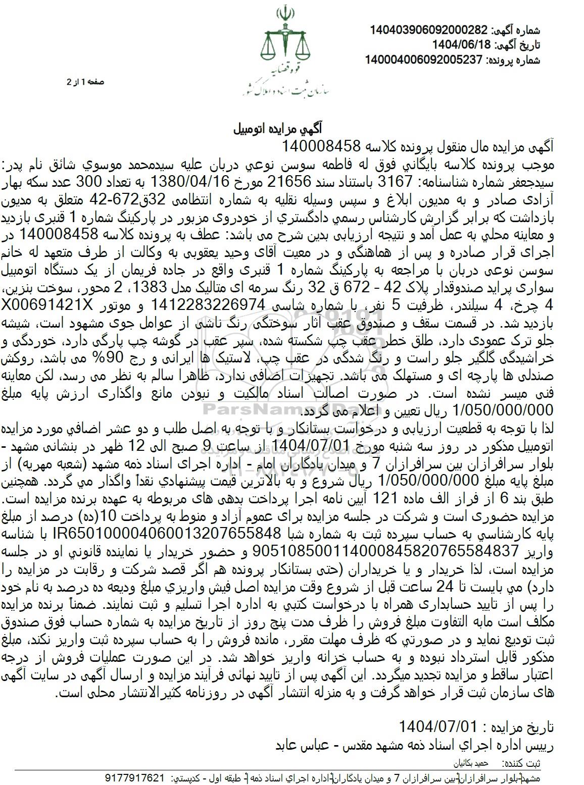 مزایده فروش یک دستگاه خودرو پراید صندوقدار مدل 1383 سرمه ای رنگ