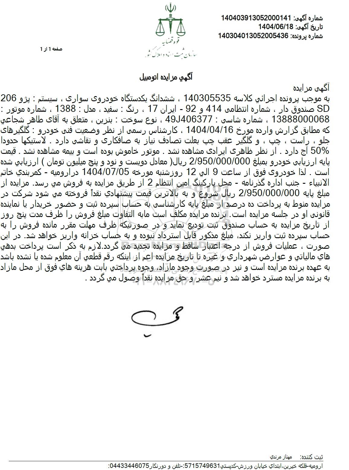 مزایده فروش یک دستگاه خودروی سواری سیستم پژو مدل 1388
