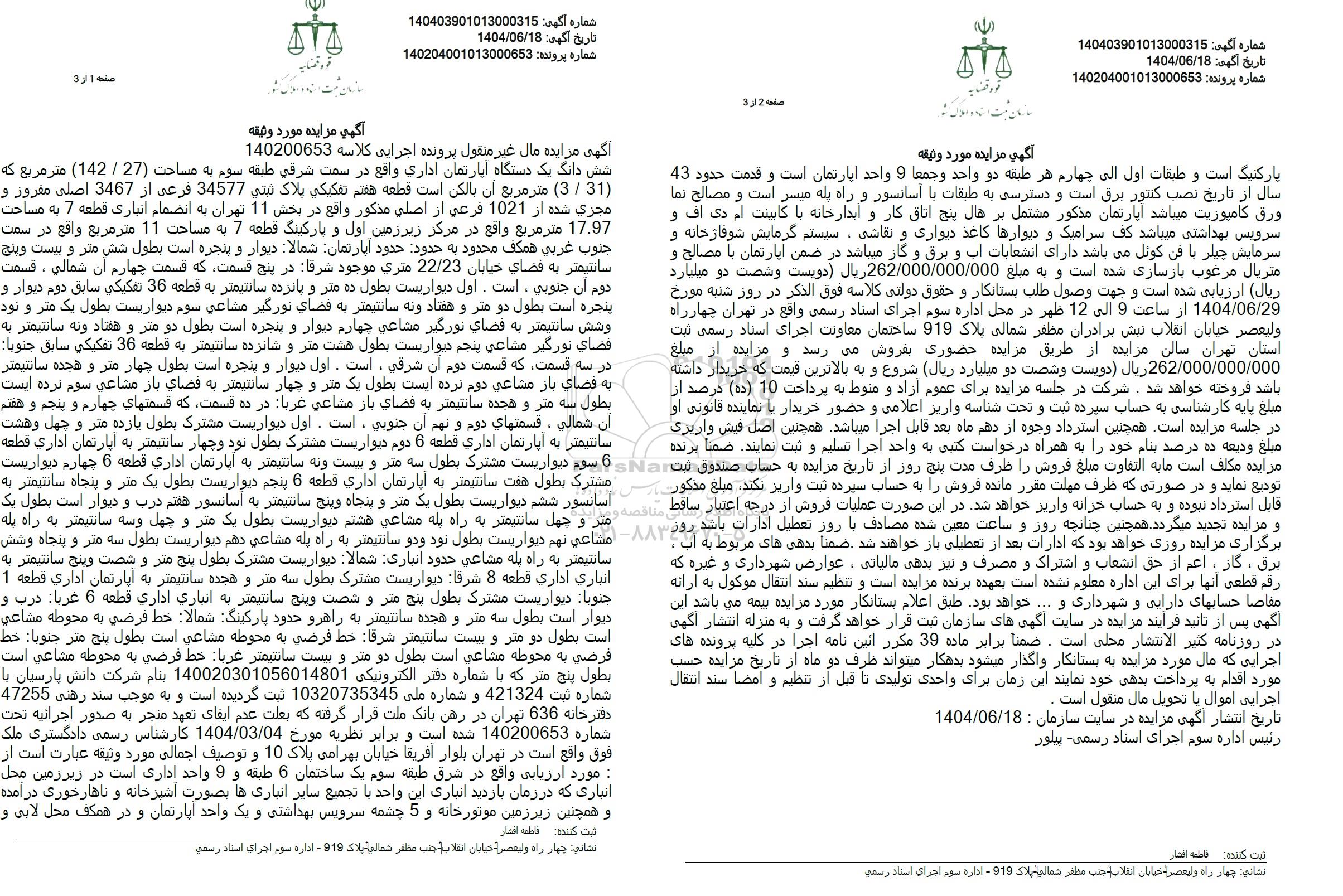 مزایده ششدانگ یک دستگاه آپارتمان اداری مساحت 142.27 مترمربع
