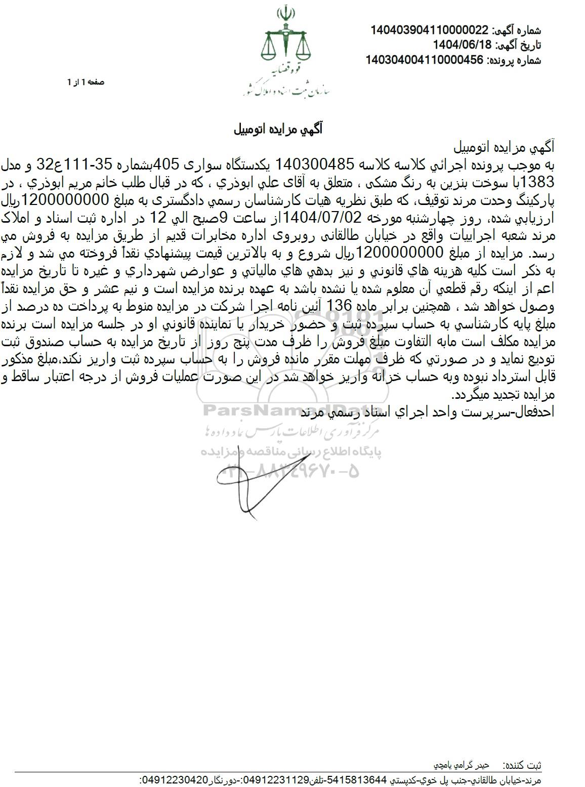 مزایده فروش یک دستگاه سواری 405 مدل 1383, مزایده فروش یک دستگاه سواری 405 مدل 1383