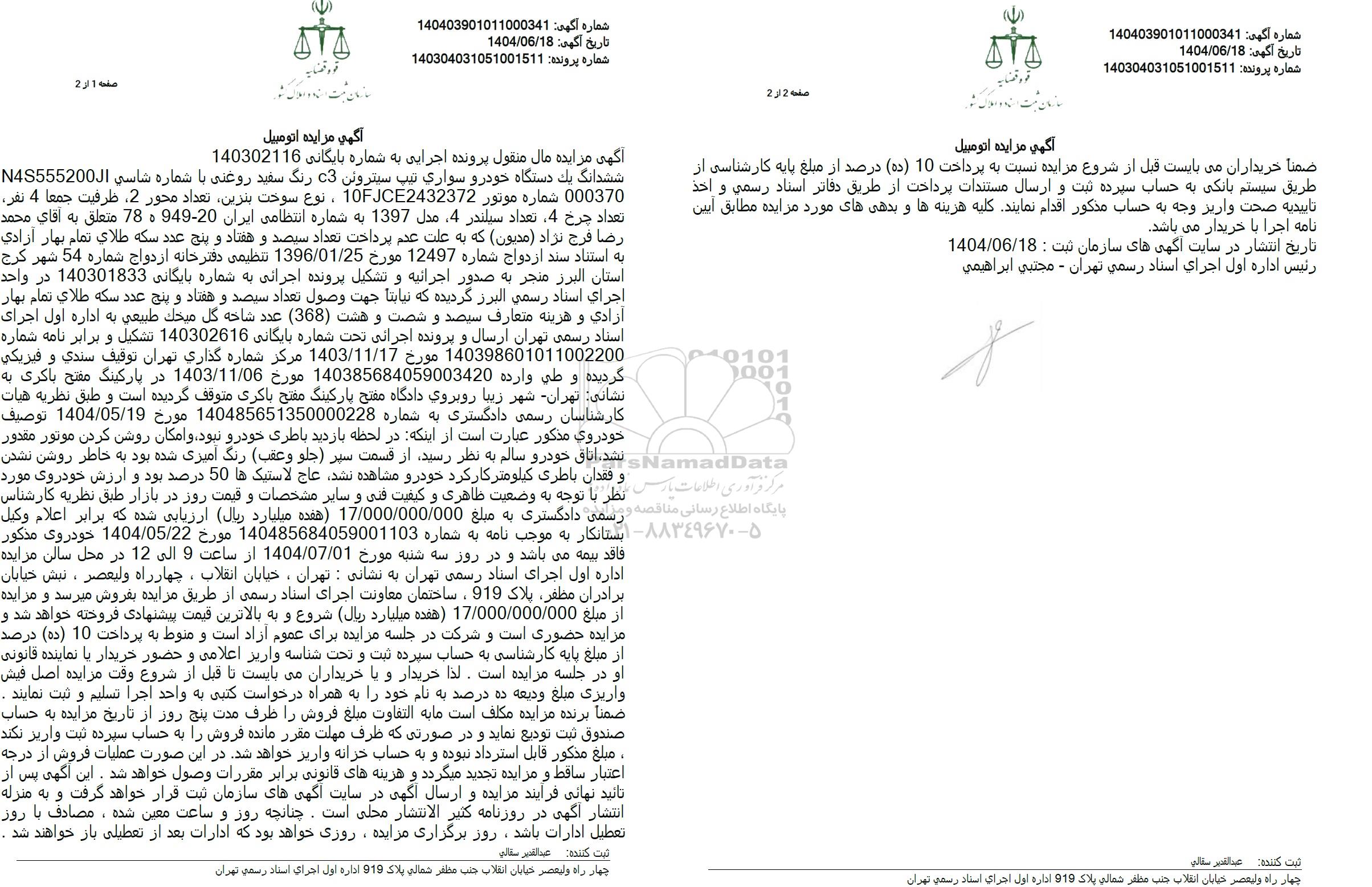 مزایده فروش ششدانگ یک دستگاه خودرو سواری تیپ سیتروئن C3 رنگ سفید روغنی مدل 1397