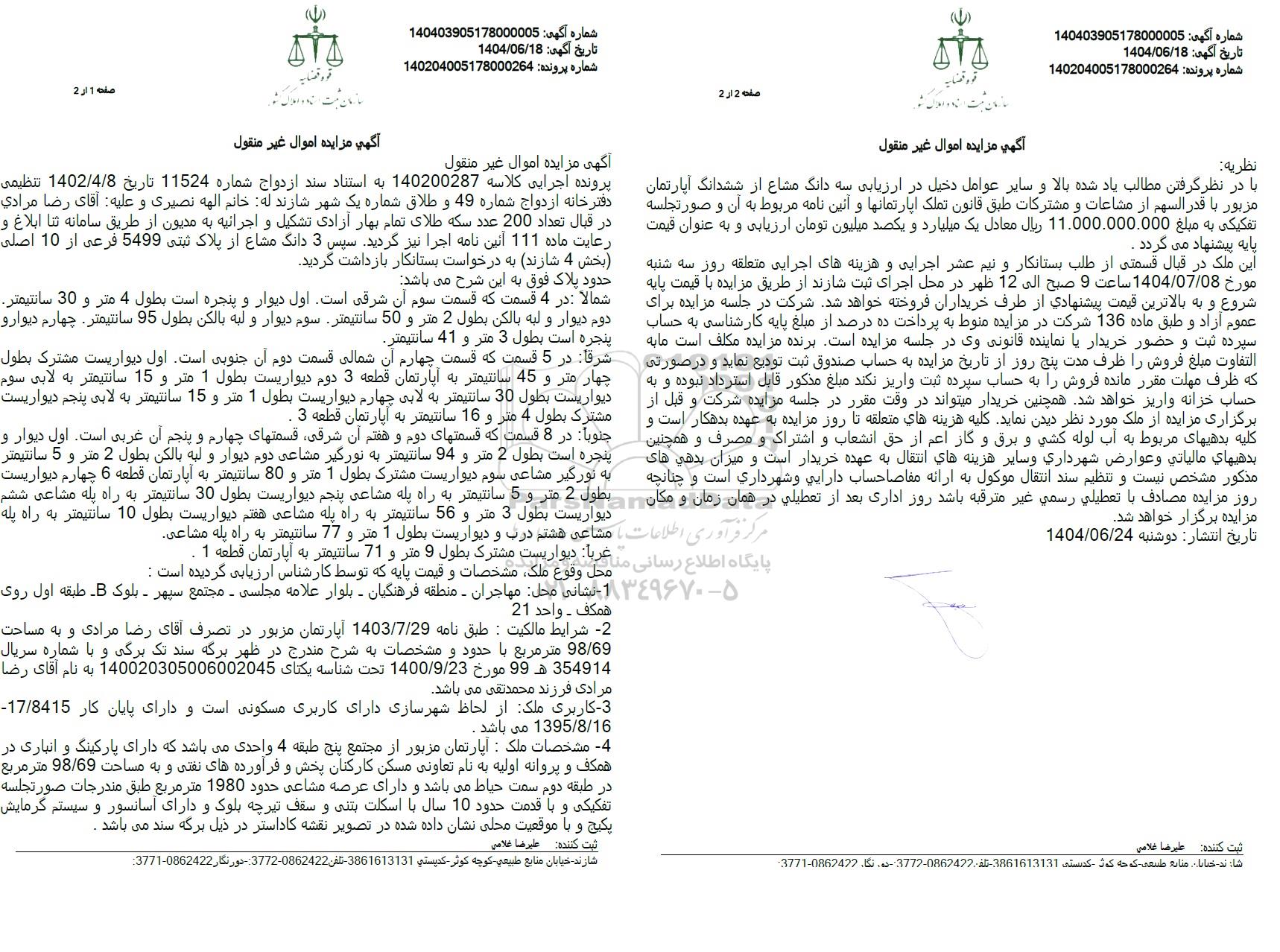 مزایده از ساعت 9 الی 12 روز سه شنبه مورخ 1404.7.8