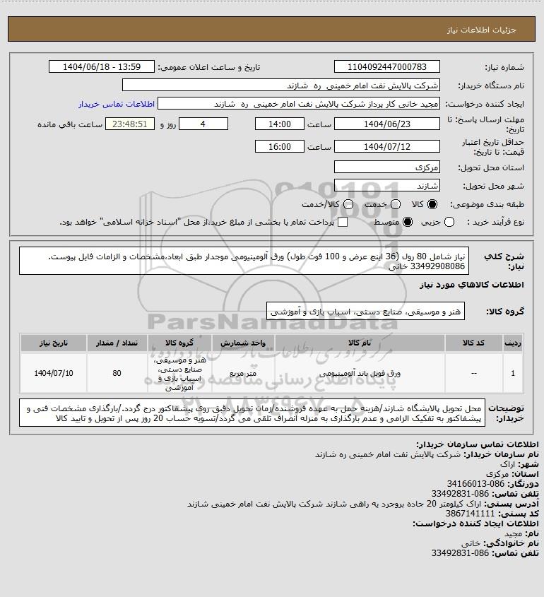 شرح کلی نیاز: نیاز شامل 80 رول (36 اینچ عرض و 100 فوت طول) ورق آلومینیومی موجدار طبق ابعاد،مشخصات و الزامات فایل پیوست. 33492908086 خانی