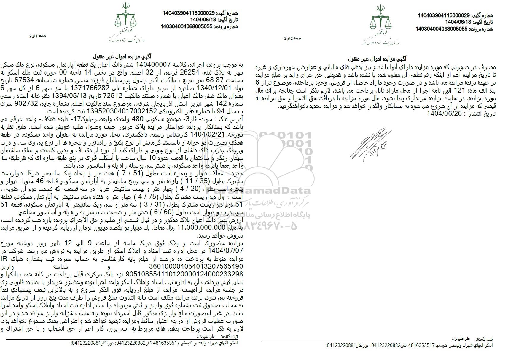 مزایده فروش یک قطعه آپارتمان مسکونی به پلاک ثبتی 26254 فرعی از 32 اصلی