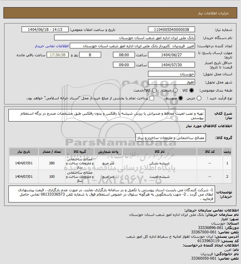 استعلام بها و موضوع استعلام استعلام تهیه و نصب لمینت محافظ و ضدپراش یا ریزش شیشه با رفلکس و بدون رفلکس طبق مشخصات مندرج در برگه استعلام پیوستی به اطلاع کلیه شرکتها و افراد متخصص واجد شرایط میرساند، آگهی گذار در نظر دارد از طریق استعلام بها، نسبت به انتخاب و دریافت پیشنهادات اقدام نماید. این استعلام با کد آگهی ثبت شده در سامانه خبرگزاری پارس نماد : 9527793 منتشر شده است. مشخصات استعلام : تاریخ شروع استعلام: 1404/06/18 آخرین مهلت ارسال پیشنهاد قیمت : 1404/06/27 و محل اجرای پروژه : استان خوزستان میباشد. استعلام قیمت مورد درخواست : استعلام تهیه و نصب لمینت محافظ و ضدپراش یا ریزش شیشه با رفلکس و بدون رفلکس طبق مشخصات مندرج در برگه استعلام پیوستی با دستهبندیهای تخصصی و گروه های مرتبط : صنایع شیشه, مصالح ساختمانی, استعلام اطلاع رسانی میگردد.