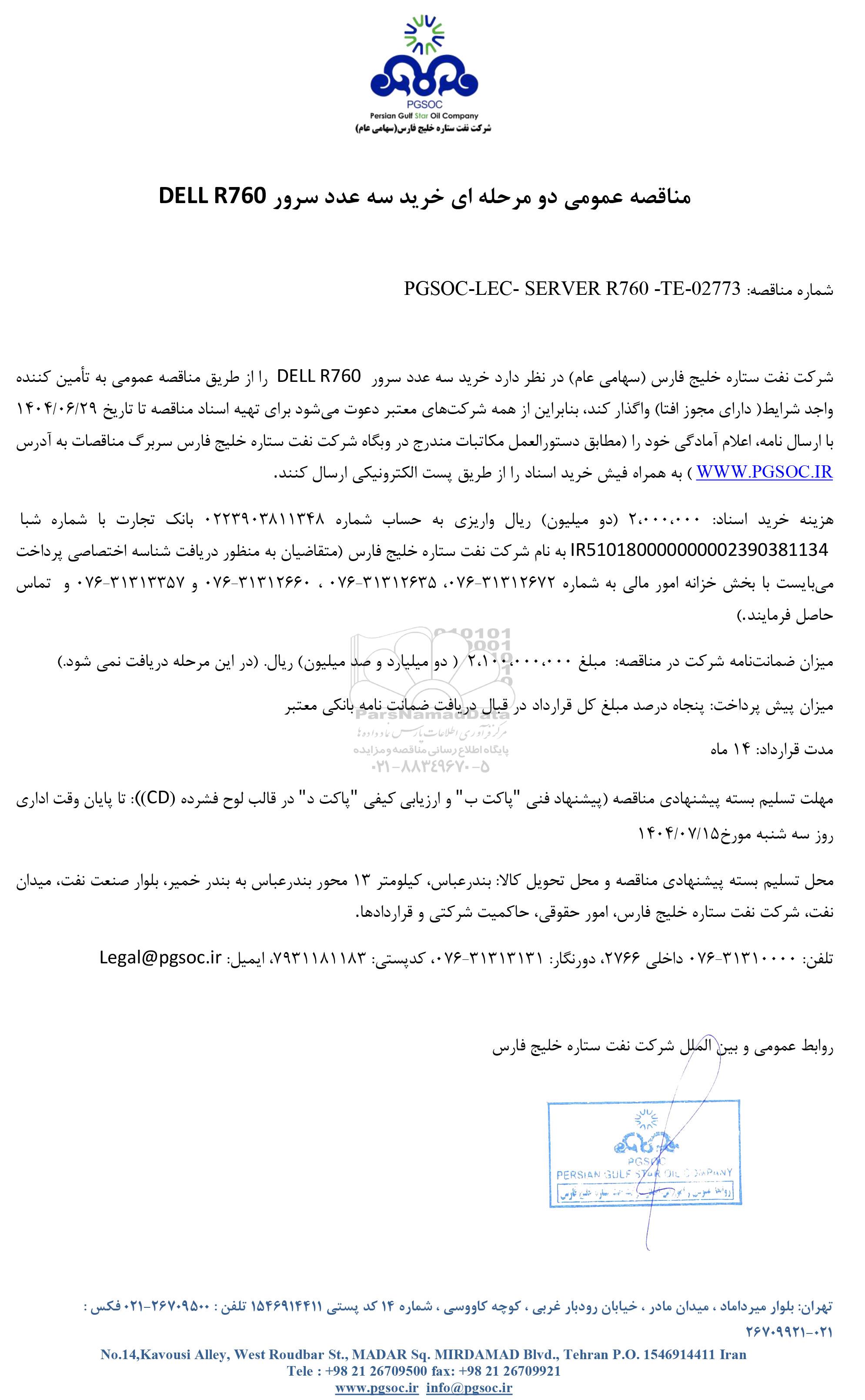 شماره مناقصه: PGSOC-LEC- SERVER R760 -TE- 02773