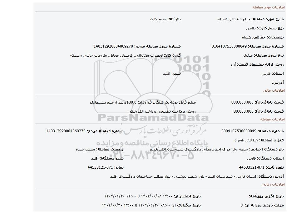 | شرح مورد معامله: حراج خط تلفن همراه | نام کالا: سیم کارت | |