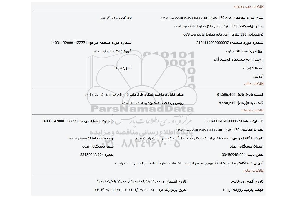 | عنوان معامله: 120 بطری روغن مایع مخلوط عادی برند لادن | ||