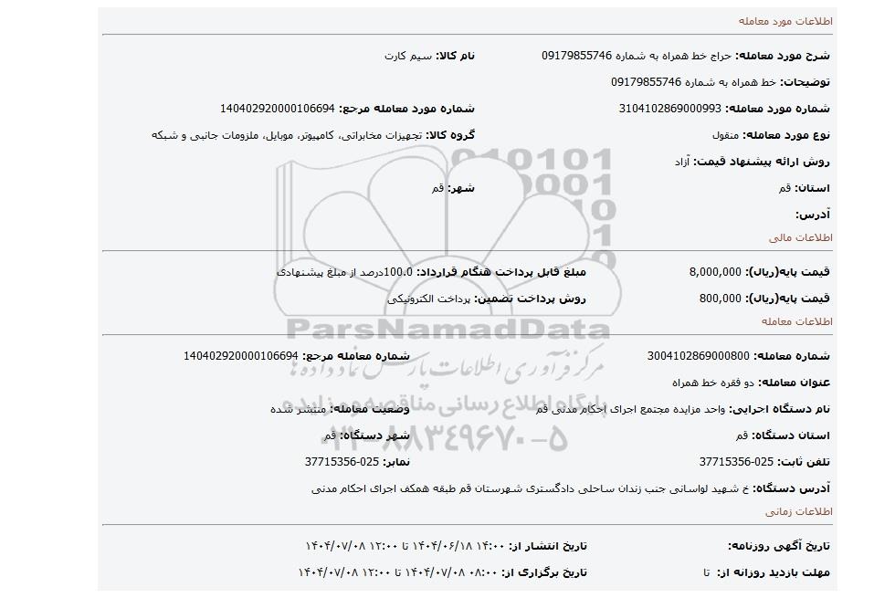| نام دستگاه اجرایی: واحد مزایده مجتمع اجرای احکام مدنی قم | وضعیت معامله: منتشر شده | |