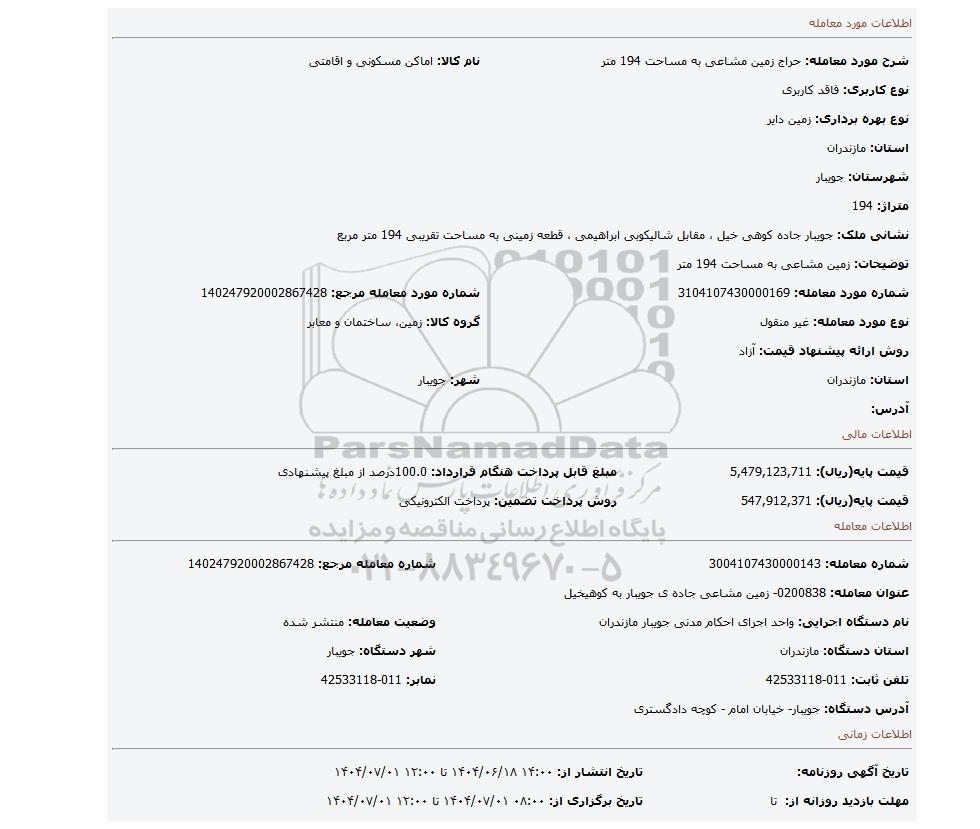 | شرح مورد معامله: حراج زمین مشاعی به مساحت 194 متر | نام کالا: اماکن مسکونی و اقامتی | |