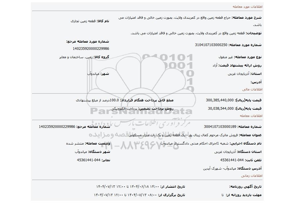 | شماره مورد معامله: 3104107103000250 | شماره مورد معامله مرجع: 140235920000229986 | |