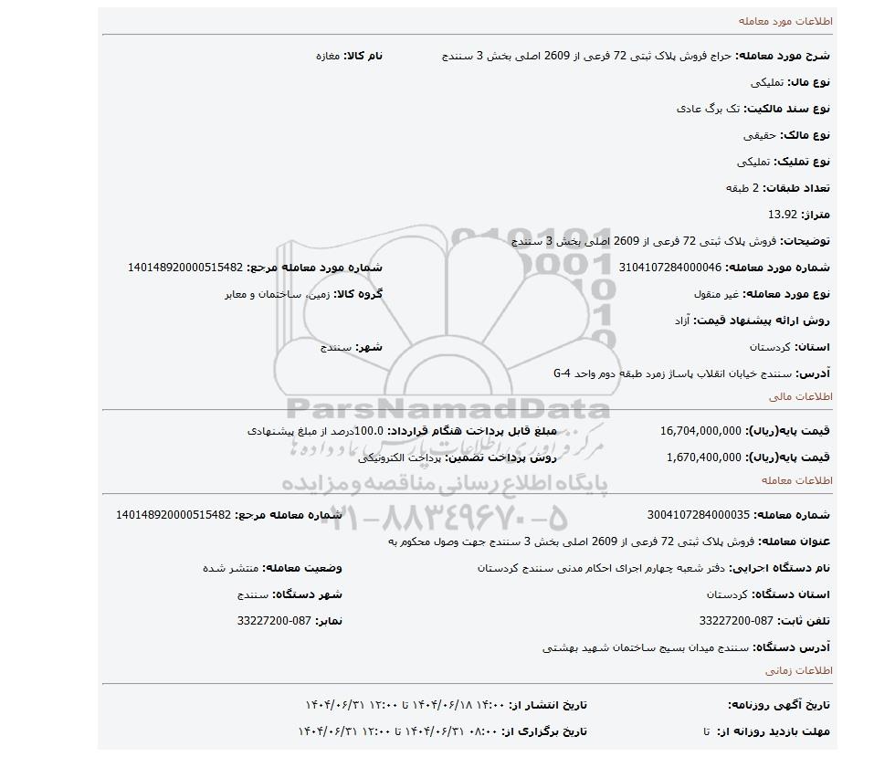 | شرح مورد معامله: حراج فروش پلاک ثبتی 72 فرعی از 2609 اصلی بخش 3 سنندج | نام کالا: مغازه | |