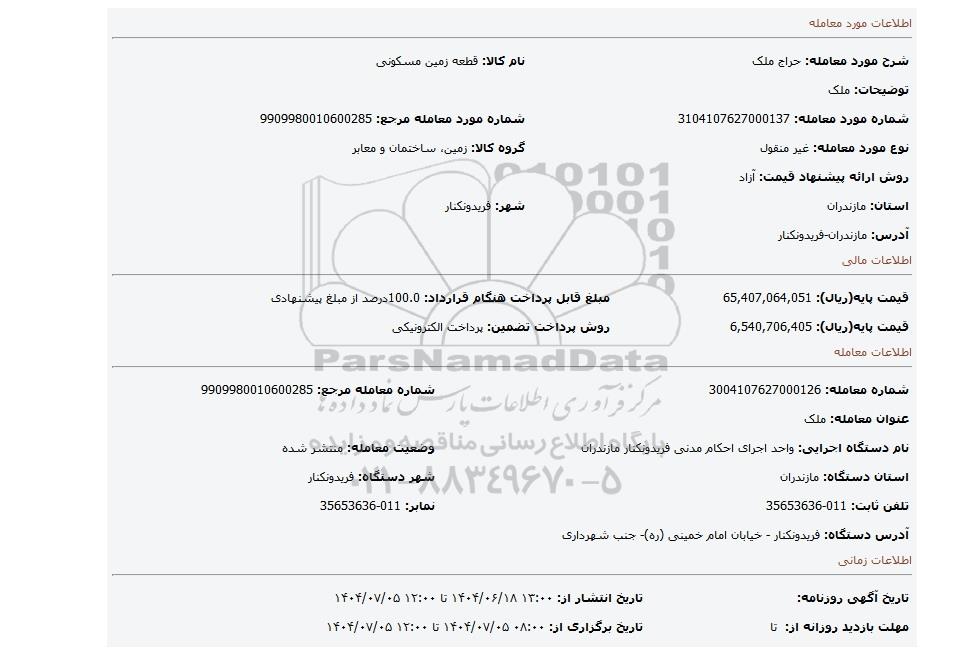| شماره مورد معامله: 3104107627000137 | شماره مورد معامله مرجع: 9909980010600285 | |