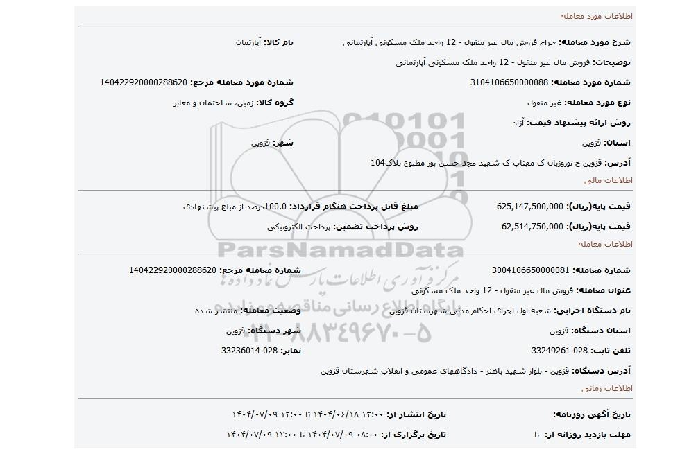 | نام دستگاه اجرایی: شعبه اول اجرای احکام مدنی شهرستان قزوین | وضعیت معامله: منتشر شده | |