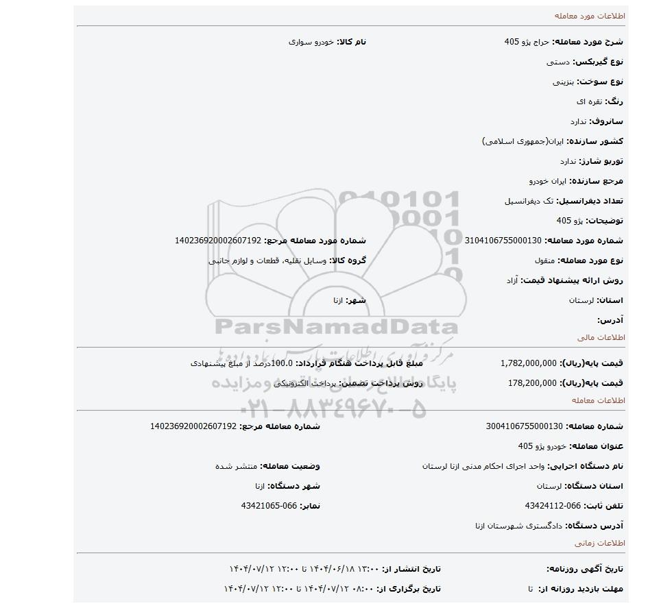| عنوان معامله: خودرو پژو 405 | ||