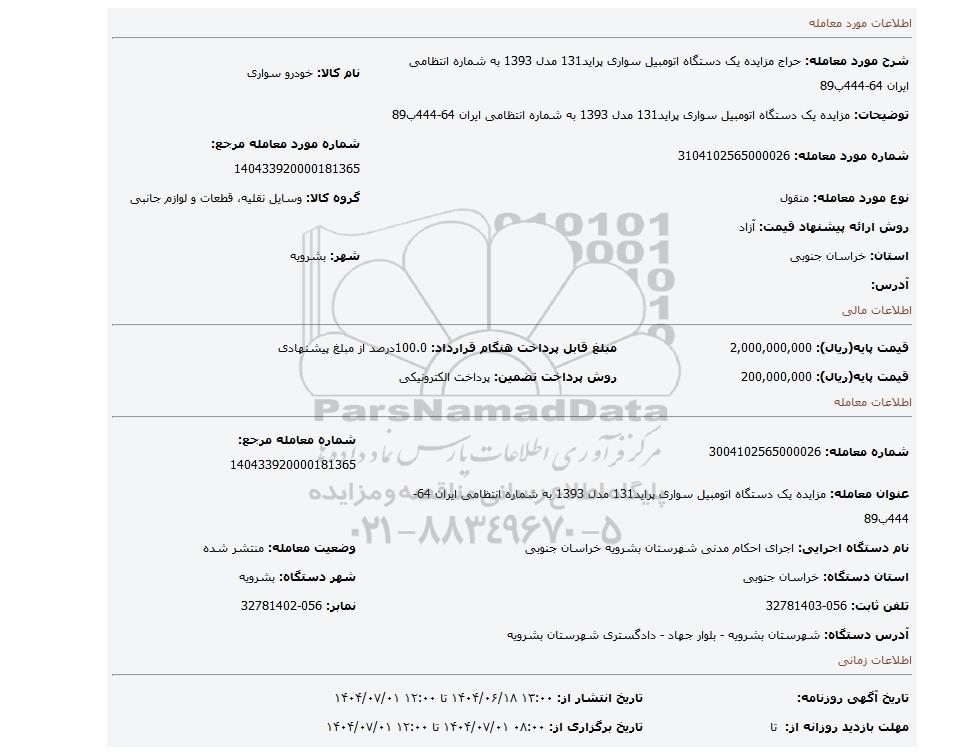 | شماره مورد معامله: 3104102565000026 | شماره مورد معامله مرجع: 140433920000181365 | |