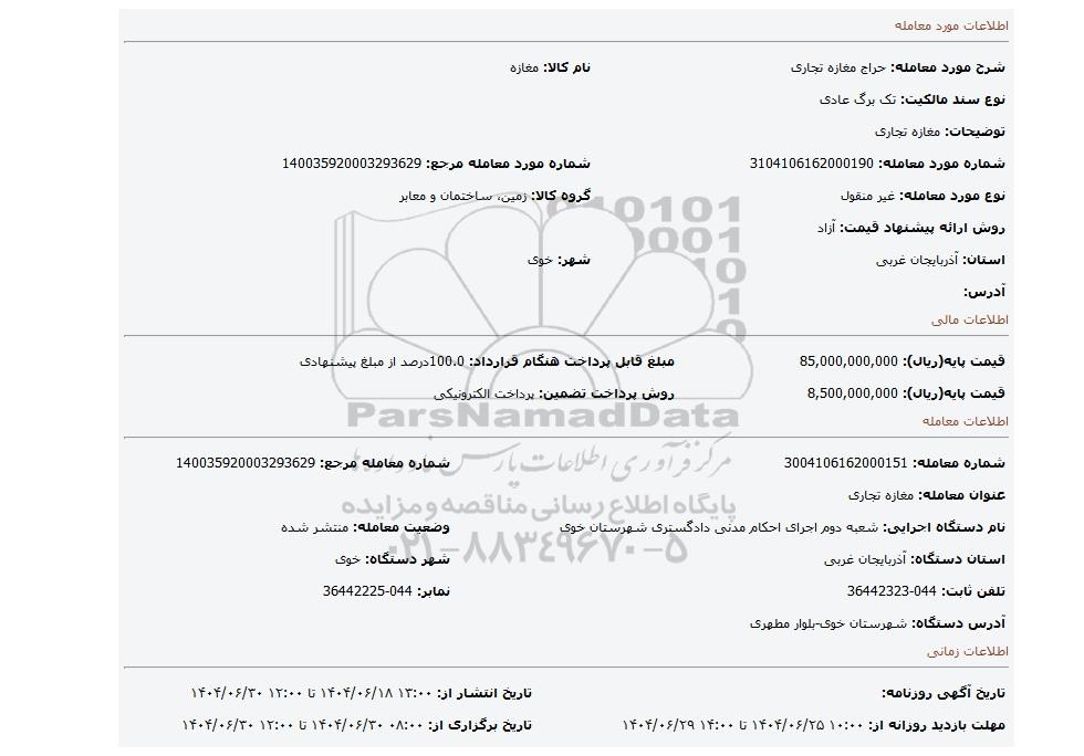 | نام دستگاه اجرایی: شعبه دوم اجرای احکام مدنی دادگستری شهرستان خوی | وضعیت معامله: منتشر شده | |