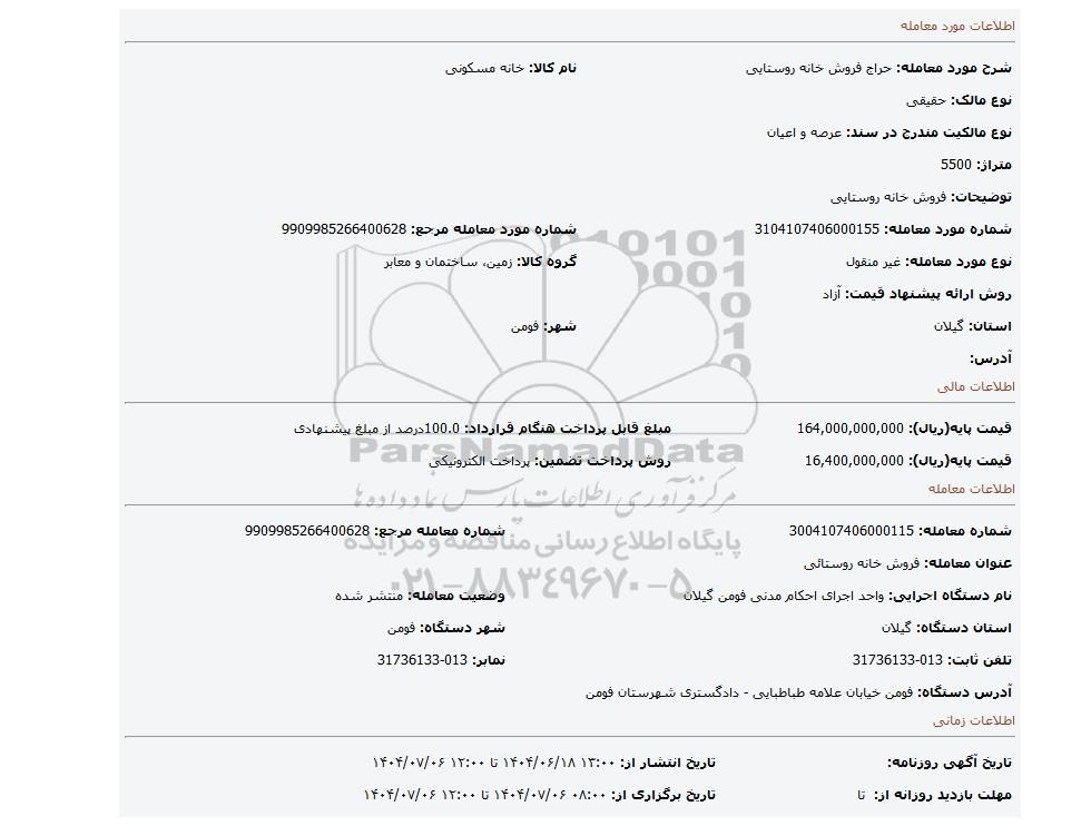 | شماره مورد معامله: 3104107406000155 | شماره مورد معامله مرجع: 9909985266400628 | |