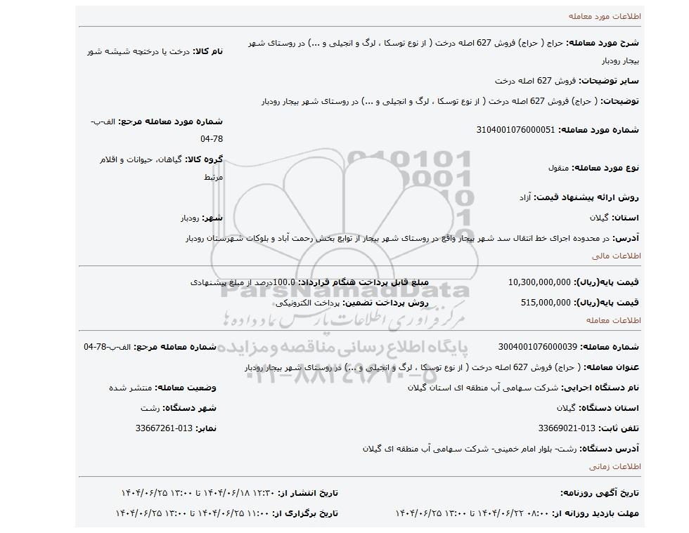 | عنوان معامله: ( حراج) فروش 627 اصله درخت ( از نوع توسکا ، لرگ و انجیلی و ...) در روستای شهر بیجار رودبار | ||