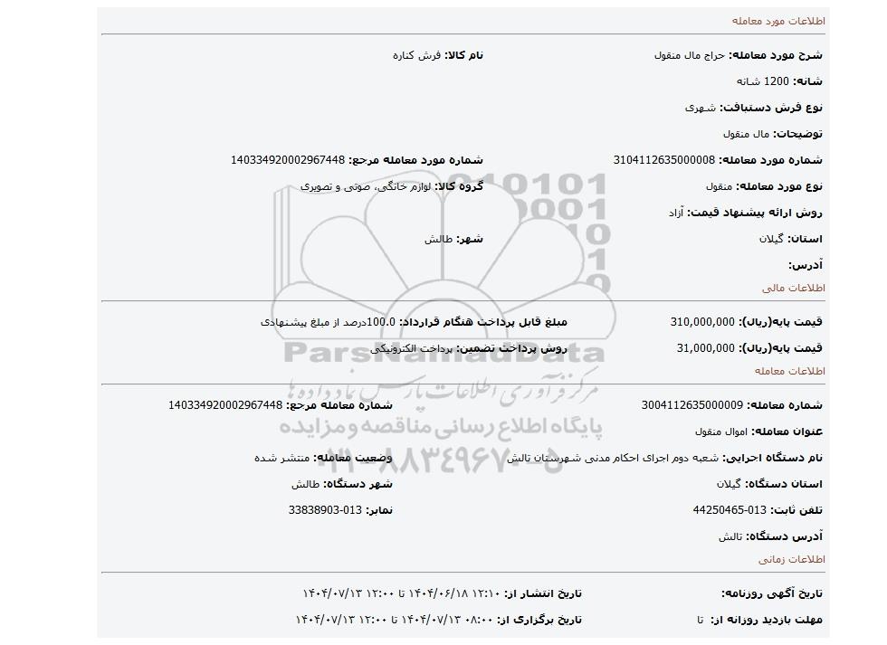 | نام دستگاه اجرایی: شعبه دوم اجرای احکام مدنی شهرستان تالش | وضعیت معامله: منتشر شده | |