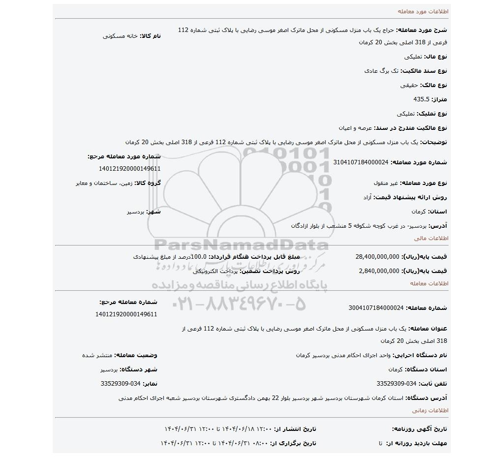 | شماره مورد معامله: 3104107184000024 | شماره مورد معامله مرجع: 140121920000149611 | |