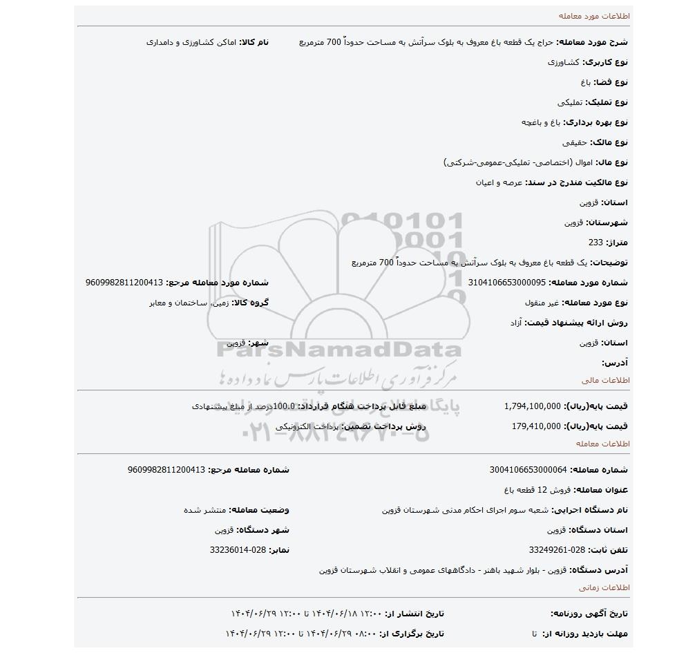 | شرح مورد معامله: حراج یک قطعه باغ معروف به بلوک سرآتش به مساحت حدوداٌ 700 مترمربع | نام کالا: اماکن کشاورزی و دامداری | |