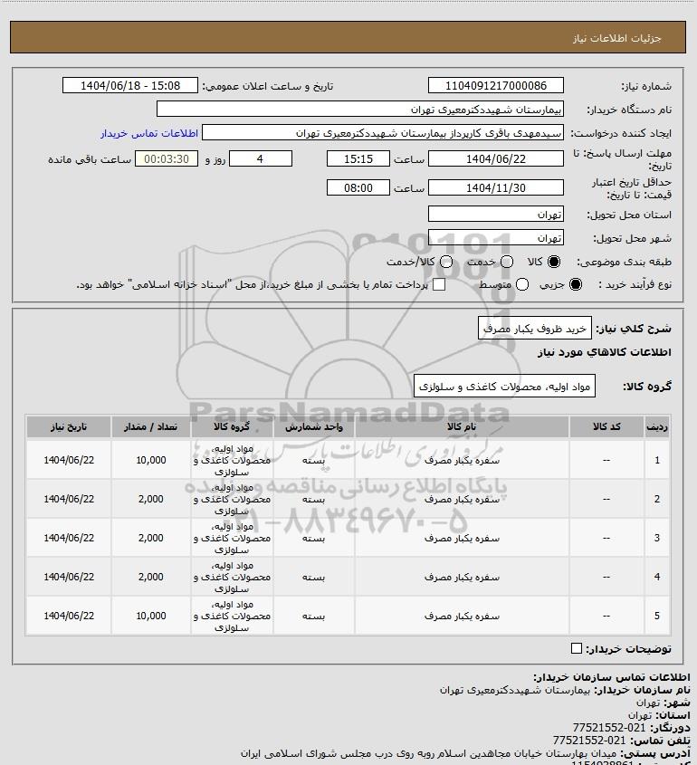 | 4 | -- | سفره یکبار مصرف | بسته | مواد اولیه، محصولات کاغذی و سلولزی | 2,000 | 1404/06/22 |