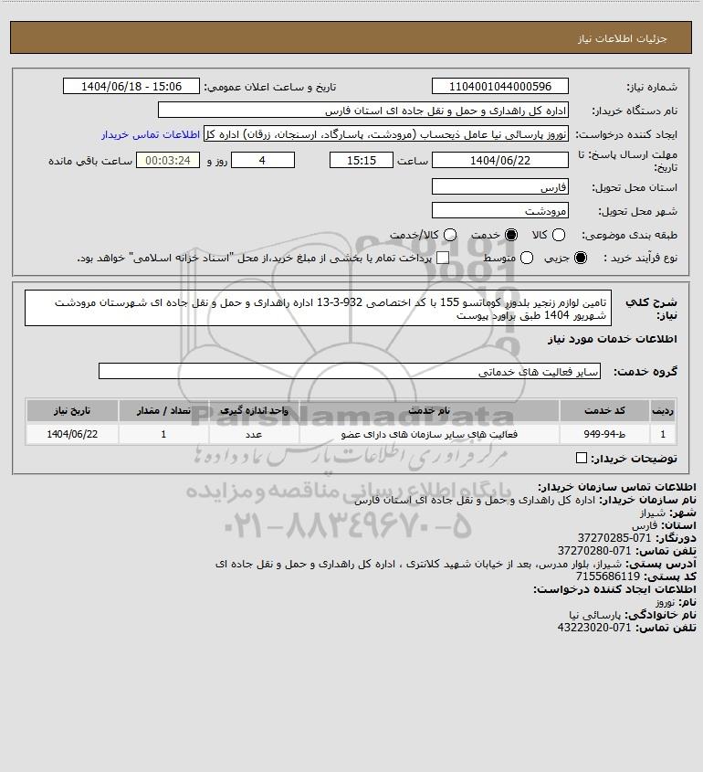 شرح کلی نیاز: تامین لوازم زنجیر بلدوزر کوماتسو 155 با کد اختصاصی 932-3-13 اداره راهداری و حمل و نقل جاده ای شهرستان مرودشت شهریور 1404 طبق برآورد پیوست
