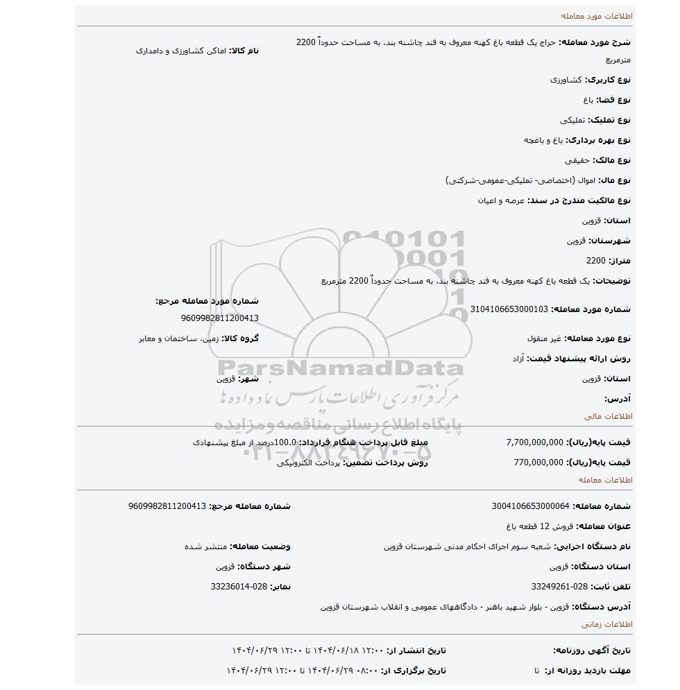| قیمت پایه(ریال): 770,000,000 | روش پرداخت تضمین: پرداخت الکترونیکی |