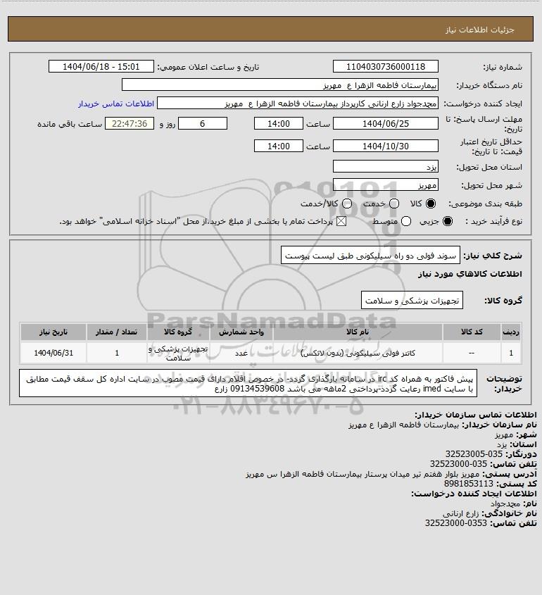 شرح کلی نیاز: سوند فولی دو راه سیلیکونی طبق لیست پیوست