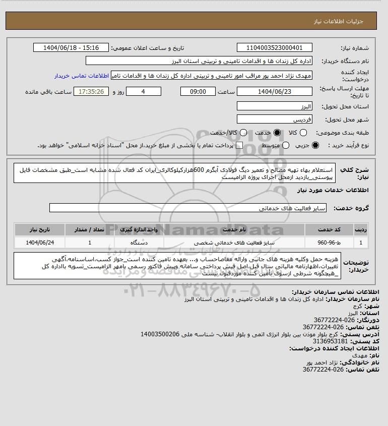 نام دستگاه خریدار:اداره کل زندان ها و اقدامات تامینی و تربیتی استان البرز