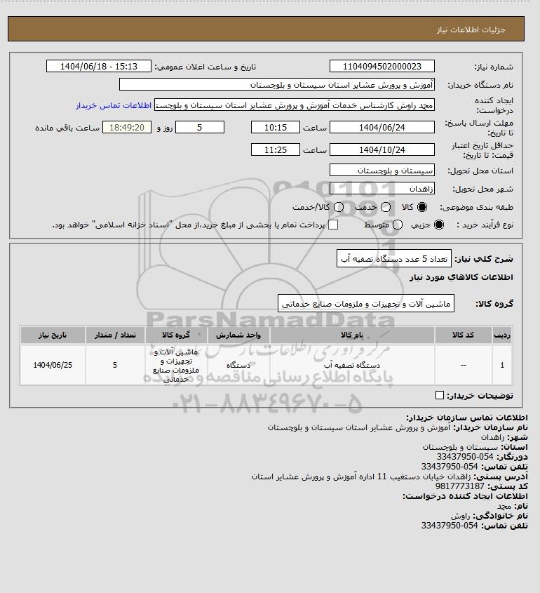 شرح کلی نیاز: تعداد 5 عدد دستگاه تصفیه آب