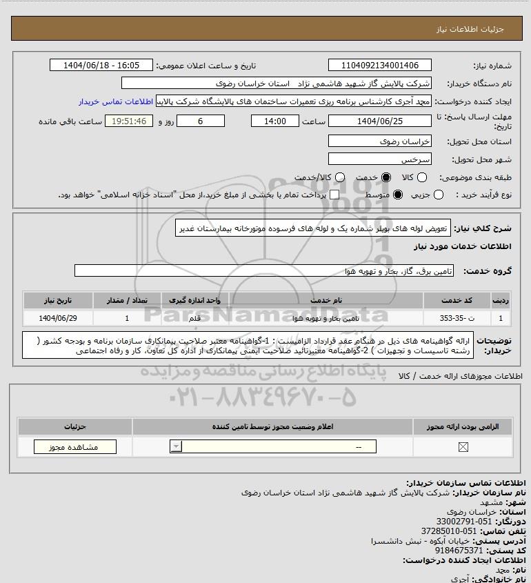 نام دستگاه خریدار:شرکت پالایش گاز شهید هاشمی نژاد استان خراسان رضوی