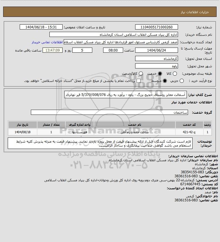شرح کلی نیاز: آسفالت معابر روستای حجیج بزرگ - پاوه - برآورد به ریال 5/370/008/076 قیر تهاتری