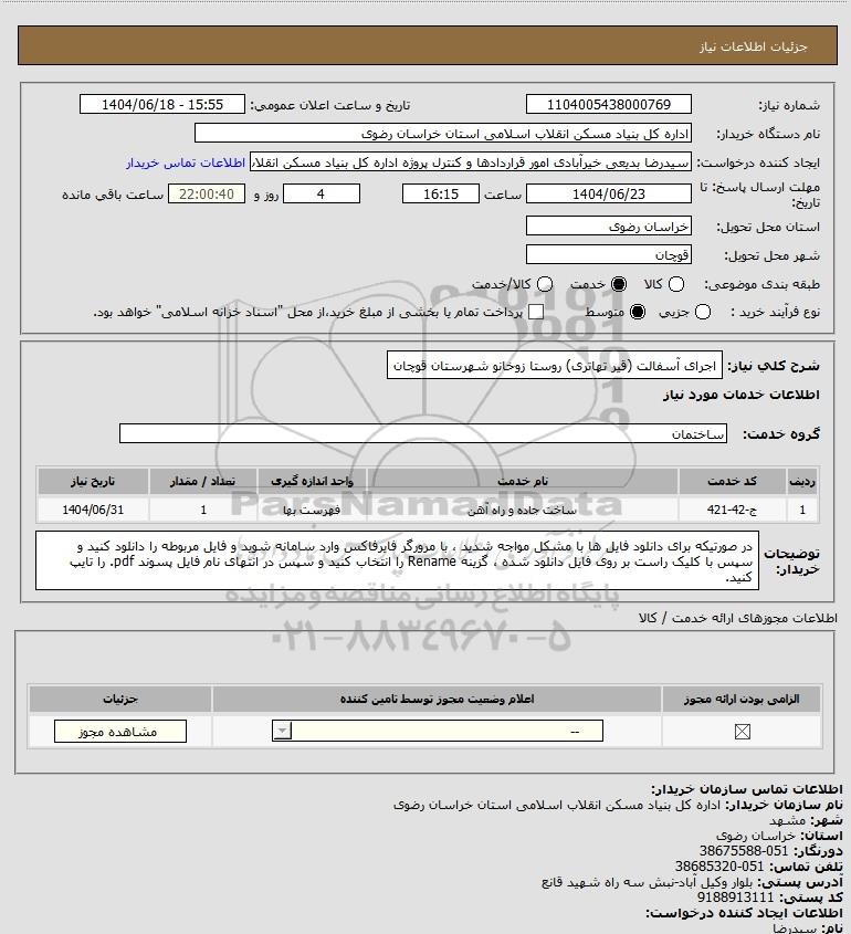 شرح کلی نیاز: اجرای آسفالت (قیر تهاتری) روستا زوخانو شهرستان قوچان