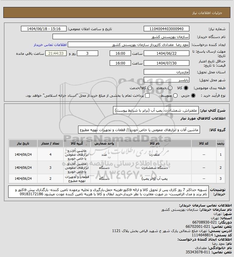 شرح کلی نیاز: علفتراش، شمشادزن، پمپ آب (برابر با شرایط پیوست)