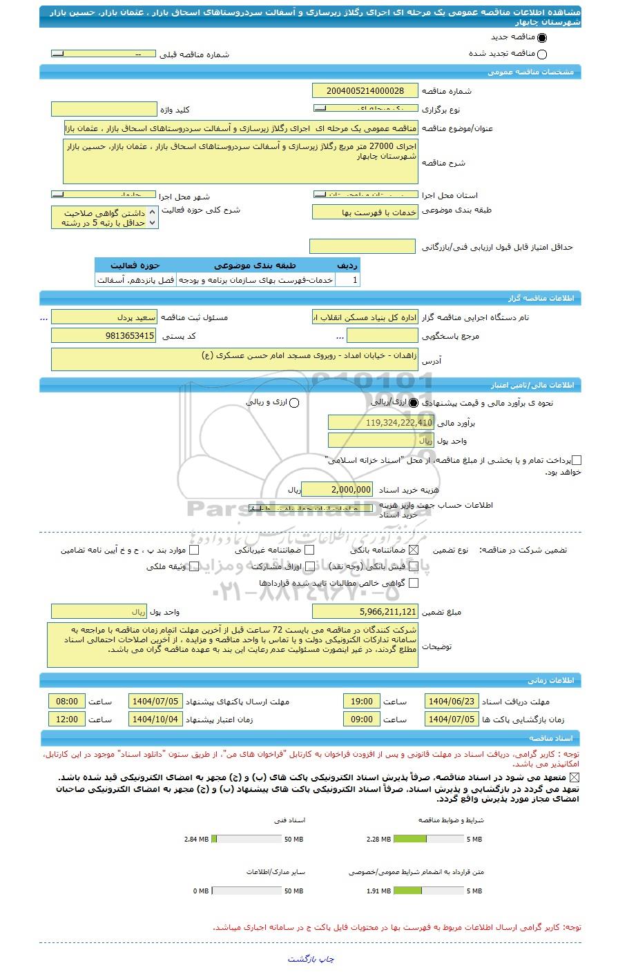عنوان/موضوع مناقصهمناقصه عمومی یک مرحله ای اجرای رگلاژ زیرسازی و آسفالت سردروستاهای اسحاق بازار ، عثمان بازار، حسین بازار شهرستان چابهار