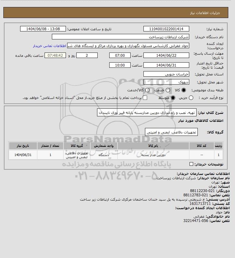 شرح کلی نیاز: تهیه، نصب و راه اندازی دوربین مداربسته پایانه فیبر نوری نایبندان