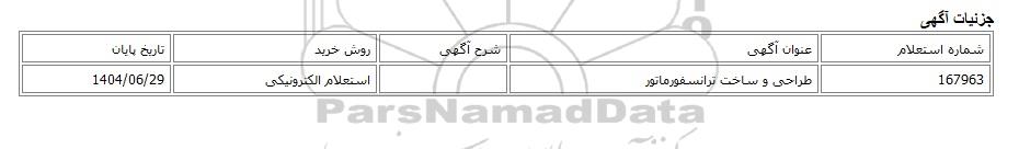 | 167963 | طراحی و ساخت ترانسفورماتور | استعلام الکترونیکی | 1404/06/29 |