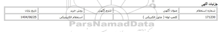 | 171230 | کلمپ لوله ( عایق الکتریکی ) | استعلام الکترونیکی | 1404/06/25 |