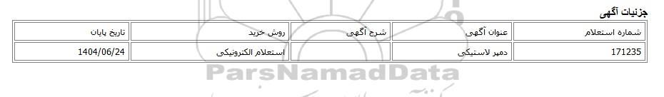| 171235 | دمپر لاستیکی | استعلام الکترونیکی | 1404/06/24 |