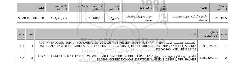 | 52503485 | انکودر و کانکتور جهت هویست جرثقیل | 2 | خرید تجهیزات وقطعات یدکی | کشوری | 1404/06/30 | سعید فرهادی | S.FARHADI@KSC.IR |