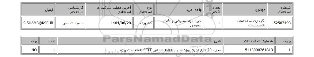 | 52503493 | نگهداری ساختمان وتاسیسات | 1 | خرید مواد مصرفی و اقلام عمومی | کشوری | 1404/06/20 | سعید شمس | S.SHAMS@KSC.IR |