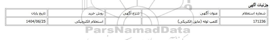 | 171236 | کلمپ لوله (عایق الکتریکی) | استعلام الکترونیکی | 1404/06/25 |