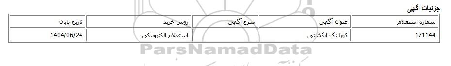 | 171144 | کوپلینگ انگشتی | استعلام الکترونیکی | 1404/06/24 |