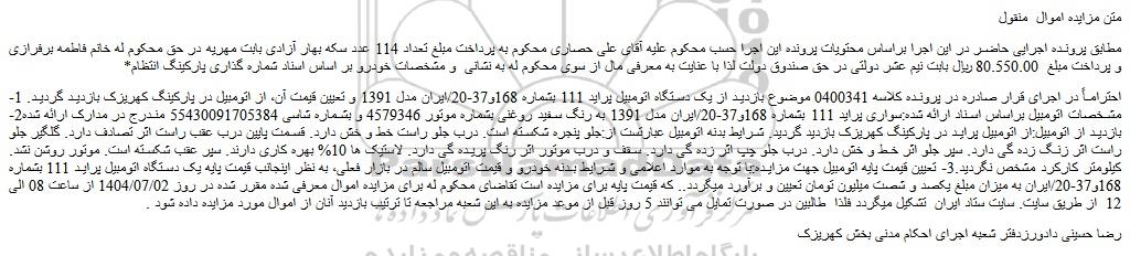 احتراماً در اجرای قرار صادره در پرونده کلاسه 0400341 موضوع بازدید از یک دستگاه اتومبیل پراید 111 بشماره 168و37-20/ایران مدل 1391 و تعیین قیمت آن، از اتومبیل در پارکینگ کهریزک بازدید گردید. 1- مشخصات اتومبیل براساس اسناد ارائه شده:سواری پراید 111 بشماره 168و37-20/ایران مدل 1391 به رنگ سفید روغنی بشماره موتور 4579346 و بشماره شاسی 55430091705384 مندرج در مدارک ارائه شده2- بازدید از اتومبیل:از اتومبیل پراید در پارکینگ کهریزک بازدید گردید. شرایط بدنه اتومبیل عبارتست از:جلو پنجره شکسته است. درب جلو راست خط و خش دارد. قسمت پایین درب عقب راست اثر تصادف دارد. گلگیر جلو راست اثر زنگ زده گی دارد. سپر جلو اثر خط و خش دارد. درب جلو چپ اثر زده گی دارد. سقف و درب موتور اثر رنگ پریده گی دارد. لاستیک ها 10% بهره کاری دارند. سپر عقب شکسته است. موتور روشن نشد. کیلومتر کارکرد مشخص نگردید.3- تعیین قیمت پایه اتومبیل جهت مزایده:با توجه به موارد اعلامی و شرایط بدنه خودرو و قیمت اتومبیل سالم در بازار فعلی، به نظر اینجانب قیمت پایه یک دستگاه اتومبیل پراید 111 بشماره 168و37-20/ایران به میزان مبلغ یکصد و شصت میلیون تومان تعیین و برآورد میگردد.. که قیمت پایه برای مزایده است تقاضای محکوم له برای مزایده اموال معرفی شده مقرر شده در روز 1404/07/02 از ساعت 08 الی 12 از طریق سایت. سایت ستاد ایران تشکیل میگردد فلذا طالبین در صورت تمایل می توانند 5 روز قبل از موعد مزایده به این شعبه مراجعه تا ترتیب بازدید آنان از اموال مورد مزایده داده شود .