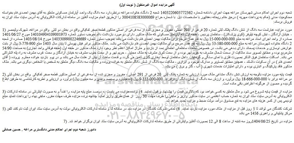 1) مورد مزایده عبارتست سه دانگ از شش دانگ پلاک ثبتی شماره 20 فرعی از 291 اصلی، مفروز و مجزی شده از سه فرعی از اصلی مذکور قطعه صفر تفکیکی واقع در بخش دو ثبتی  واقع در مراغه، شهرک ولیعصر ، خیابان آزادگان ، نبش کوچه نیلوفر (کوی پزشکان) ، ساختمان پردیس ، طبقه اول که آپارتمان مسکونی که ملک مذکور دارای دو مورد بازداشت دائم بموجب دستور شماره 140104904109001973 مورخ 1401/06/27 صادره از واحد اجرای اسناد مراغه به مبلغ 15،000،000،000 ریال به نفع همان مرجع برای مالکیت بهمن احمدی فام بازداشت می باشد بموجب دستور شماره 14033099002246689 مورخ 1403/08/14 صادره از شعبه 2 دادگاه خانواده شهرستان مراغه به مبلغ 53،580،000،000 ریال ریال به نفع همان مرجع برای مالکیت بهمن احمدی فام بازداشت می باشد .ملک مذکور برابر فیش پیوستی تا پایان سال 1403 مبلغ 3،779،900 ریال از بابت عوارض نوسازی و خدمات پسماند دارای بدهی می باشد، در خصوص تخلفات ساختمانی احتمالی بعد از بازدید و متراژ امکان اعلام نظر وجود دارد.ملک مذکور در طبقه اول (طبقه فوقانی واحد تجاری) به مساحت 54/90 مترمربع بوده و مطابق تصویر سند مالکیت از سمت شمال مشرف به حریم نهر بوده و از سمت شرق مشرف به ملک مجاور ، حریم نهر و از سمت جنوب مشرف به خیابان آزادگان و سمت غرب مشرف به راه پله اشتراکی می باشد. اسکلت ساختمان فوق الذکر بصورت فلزی با نمای سنگی و گرمایش  داخل ساختمان توسط  بخاری گازی تامین می گردد و قدمت ساخت آن بیش از هشت سال می باشد و در یوم  بازدید خوانده محترم  پرونده ( آقای احمدی فام ) در آن سکونت داشتند ، همچنین مطابق تصاویر و مدارک موجود و ابرازی ، مالکیت سه دانگ از شش دانگ متعلق به خوانده پرونده و مالکیت سه دانگ دیگر متعلق به شخص یا اشخاص دیگری می باشد. ملک مذکور فاقد پارکینگ و انباری بوده و دارای امتیازات خدمات شهری ( آب ، گاز و برق ) می باشد .