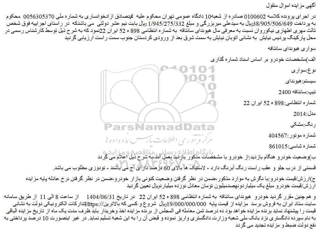 در اجرای پرونده کلاسه 0100602 صادره از شعبه10 دادگاه عمومی تهران محکوم علیه  محمدصادق ازادخوانساری به شماره ملی 0056305370  محکوم به پرداخت 38/905/506/649ریال به سیدعلی میربزرگی و مبلغ 1/945/275/332 ریال بابت نیم عشر دولتی  می باشدکه  در راستای اجراییه فوق شخص ثالث مهری اطهاری نیکوروان نسبت به معرفی مال هیوندای سانتافه  به شماره انتظامی 898 ه 52 ایران 22نمود که به شرح ذیل توسط کارشناس رسمی در محل پارکینگ پردیس نیایش  به نشانی اتوبان نیایش به سمت شرق بعد از ورودی کردستان جنوب سمت راست ارزیابی گردید
